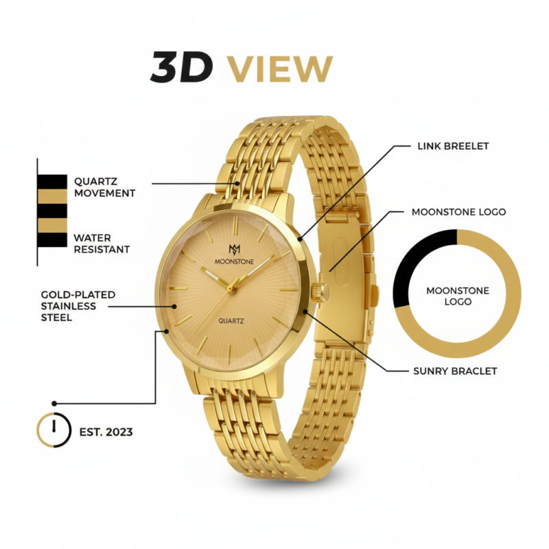 Monochromatic Gold Finish: Features a luxurious all-gold design from the stainless steel case to the bracelet.