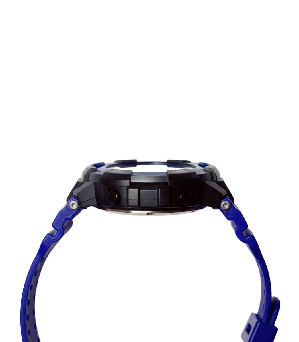 Sharp Design: Striking blue bezel contrast on a matte black rugged body. Dual Timekeeping: Simultaneous analog hands and digital display for precision. Tough Build: Designed with shock-resistant materials for an active lifestyle. Smart Functions: Includes digital date, alarm, and mode settings for daily use. Comfort Grip: Flexible and durable black silicone strap for all-day wear.