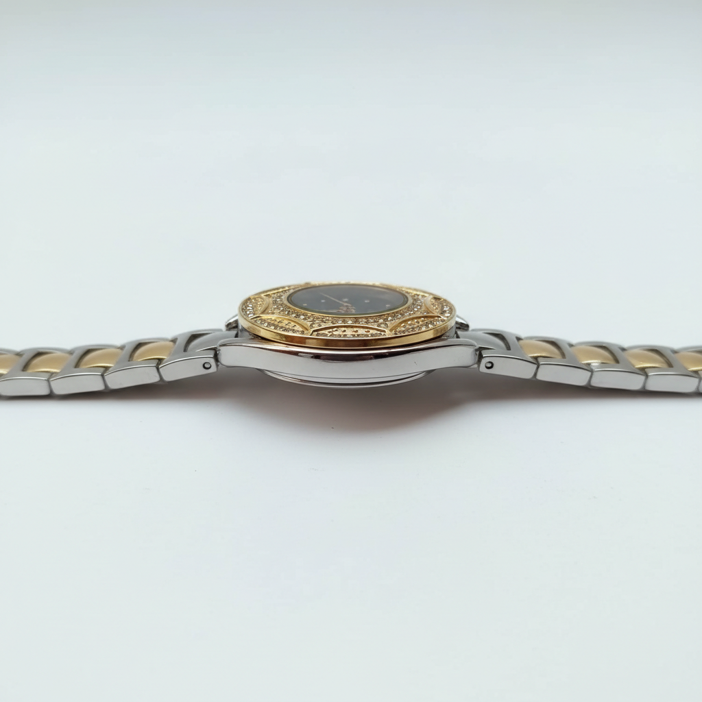 Crystal Bezel: Features an intricate gold-plated bezel studded with sparkling crystals for a luxurious look. Black Dial: Includes a sleek black face with minimalist gold markers for high readability. Two-Tone Bracelet: Crafted with a durable silver and gold stainless steel link strap. Quartz Precision: Powered by reliable quartz movement for accurate timekeeping.