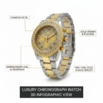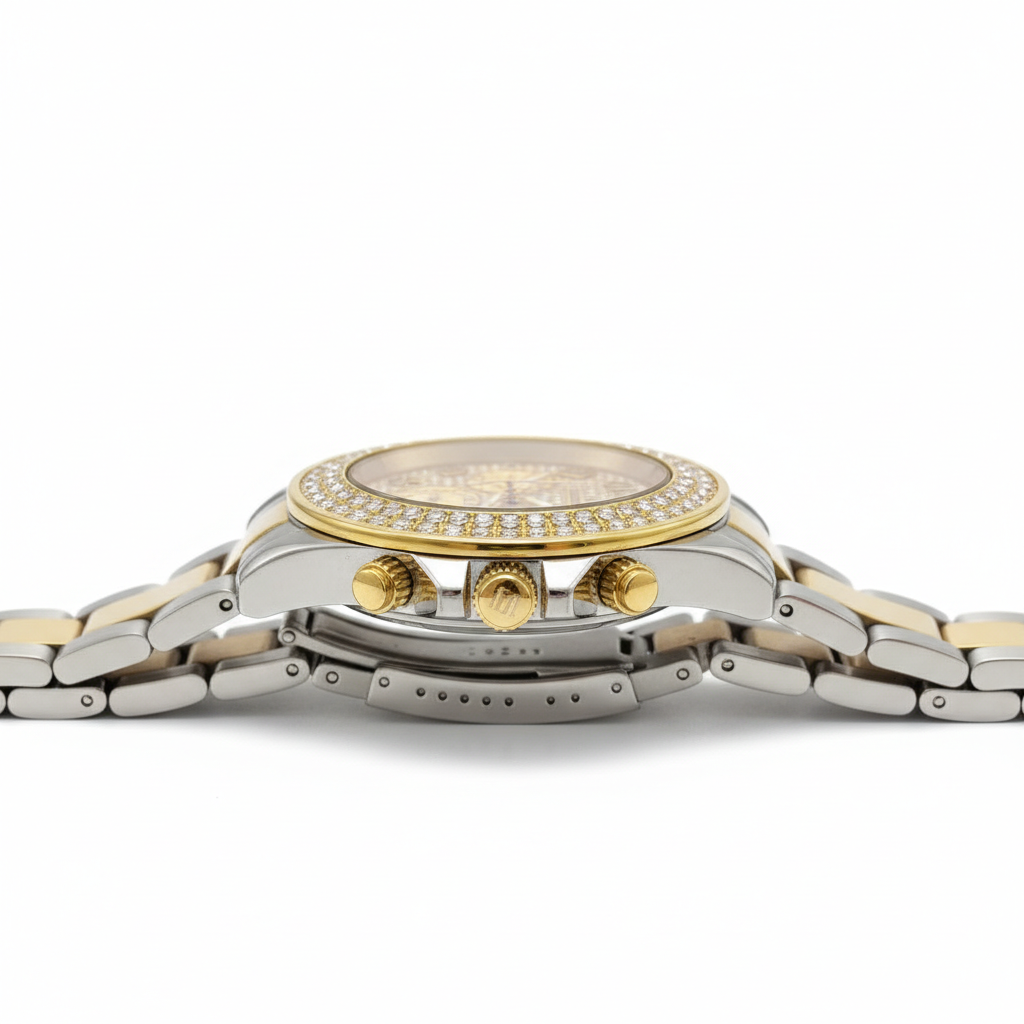 Category: Watches Tags: Chronograph-Dial, Crystal-Watch, Diamond-Watch, Gold-Bezel, Luxury Timepiece, Mens Fashion, Statement-Style, Two-Tone-Bracelet