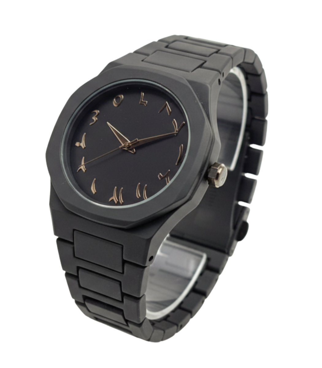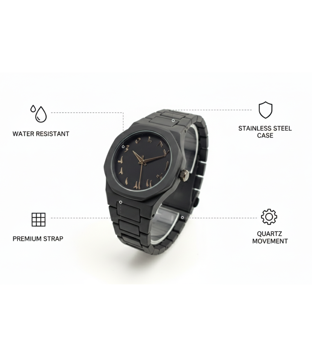 • Unique Dial: Features elegant bronze-tone Arabic calligraphy numerals on a minimalist black face.