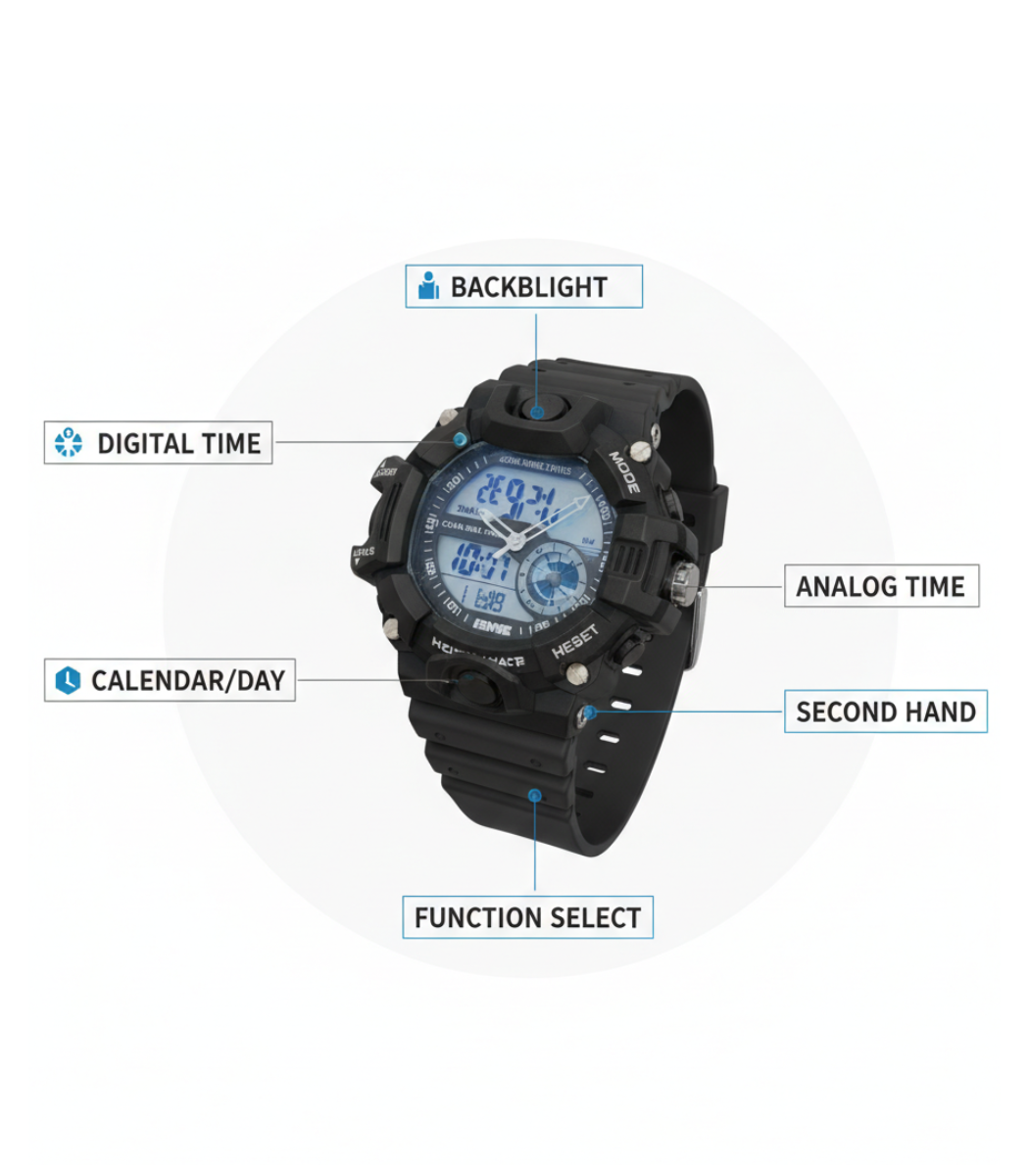 • Dual Display: Combination of digital and analog time for maximum functionality.