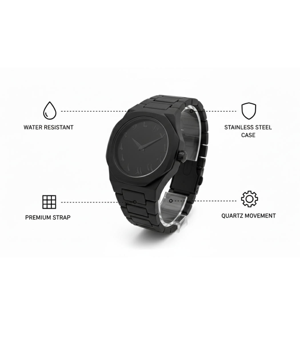 Title: Men’s All Black Stealth Arabic Dial Octagonal Watch