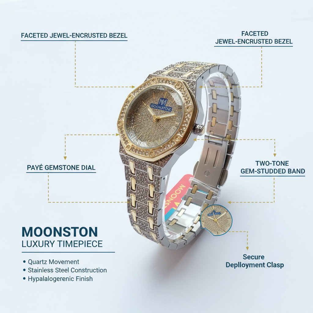 Intricate Dial: Features a unique “Moon One” branded dial with a highly textured, sparkling finish. Fully Iced Out: The bezel, case, and bracelet are encrusted with simulated diamonds for ultimate shine. Octagonal Bezel: Modern design inspired by luxury sports watches, featuring a blend of gold and silver tones. Statement Accessory: Perfect for evening wear, parties, or making a bold fashion statement.